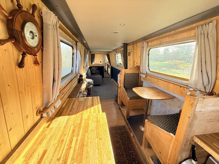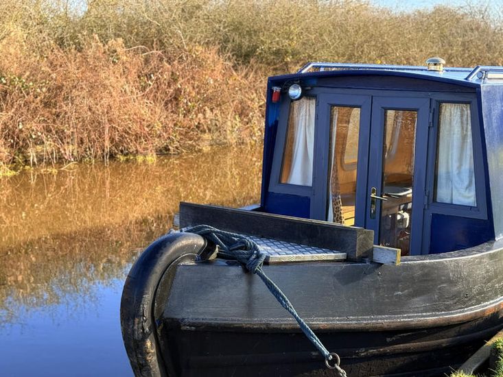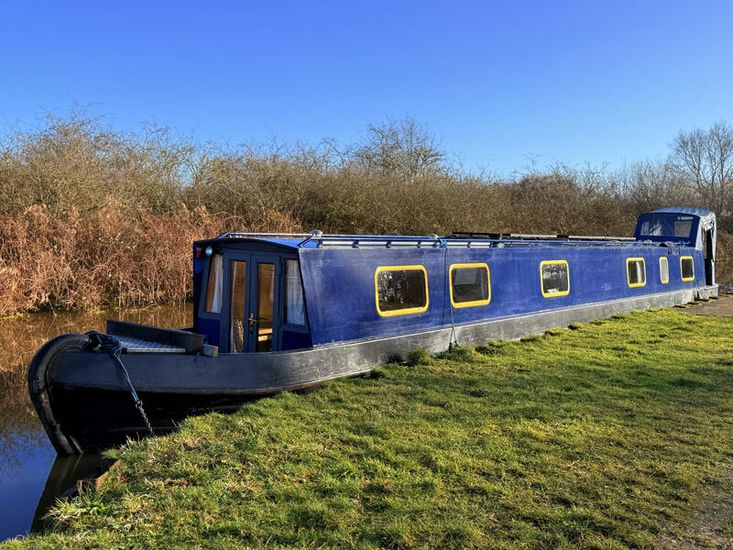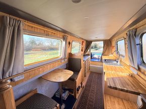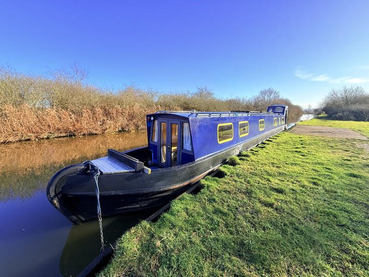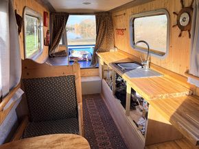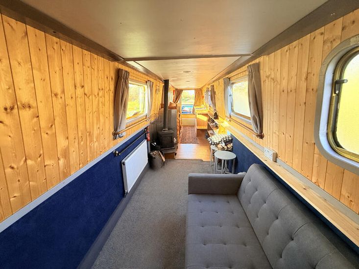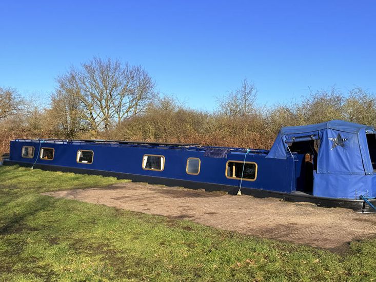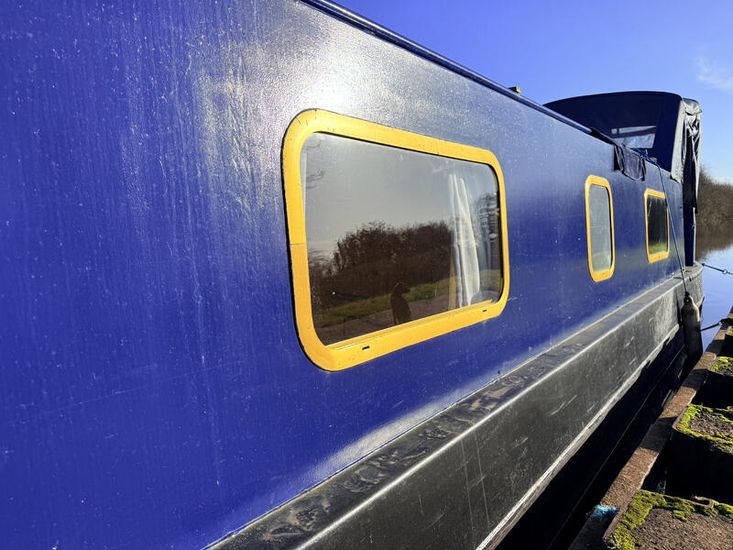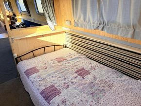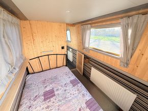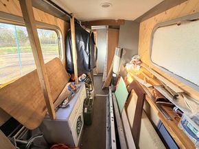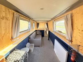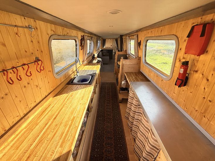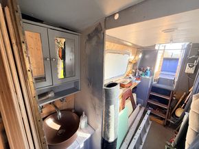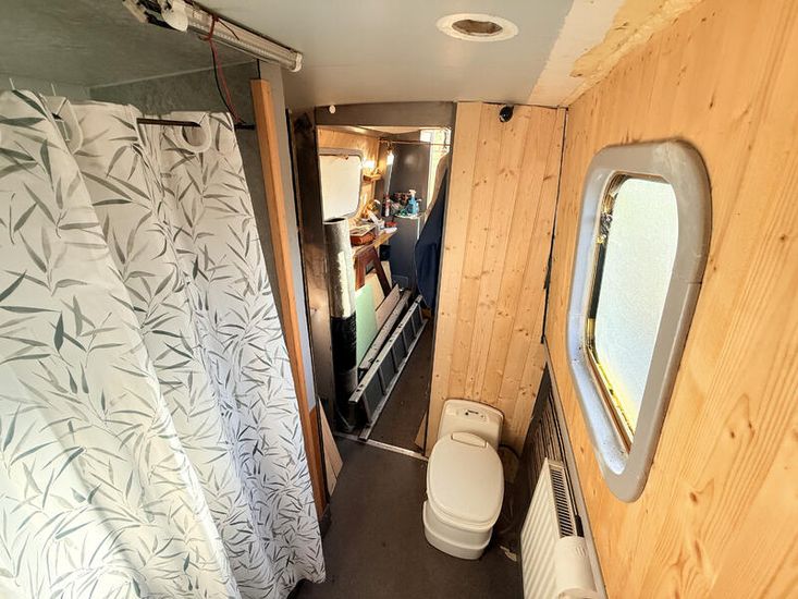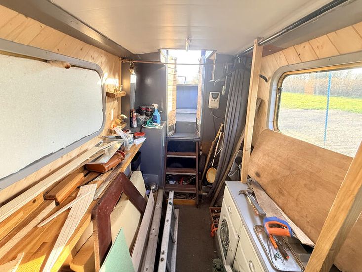 Upon entering from the stern, there is a workshop, fitted to the current owners' requirements. Onward from this, a shower room fitted with a large stand-up power shower, a high point with great water pressure. Following on from this, a sleeping arrangement in the form of a freestanding double bed. Following on into the cozy saloon, she features a freestanding sofa bed, creating another sleeping solution. A small slimline dinette is next, handmade and perfect for meals onboard. Into the walkthrough galley, she boasts ample storage below the countertops, making her the perfect liveaboard. If converted to feature gas and appliances, there is so much space for more. There is a large bow area at the boat's nose. The paintwork is in good condition, and she is equipped with a large solar power system, four domestic batteries, one starter battery, and a large onboard inverter.