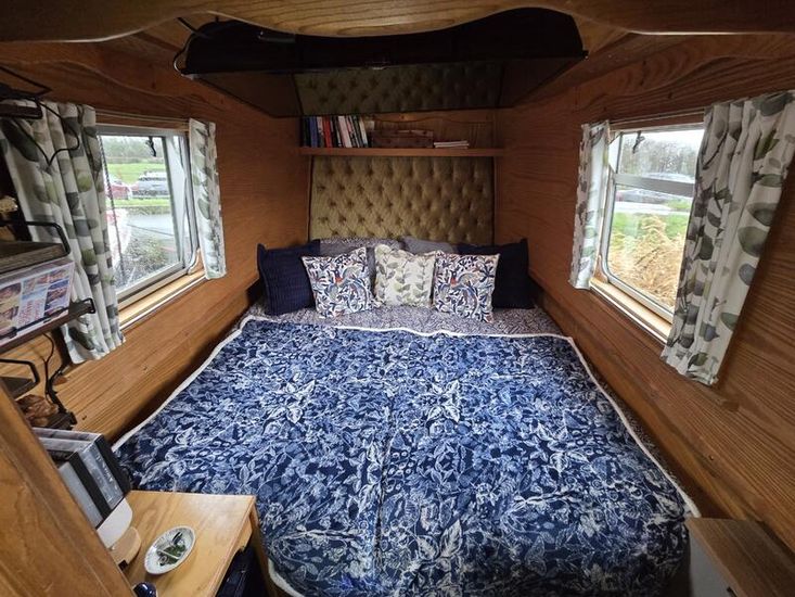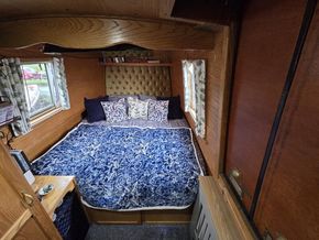 Bedroom: Large fixed double bed with new padded headboard, large wardrobe, windows and carpets, large ceiling-mounted TV, side hatch.
