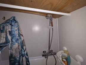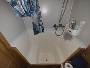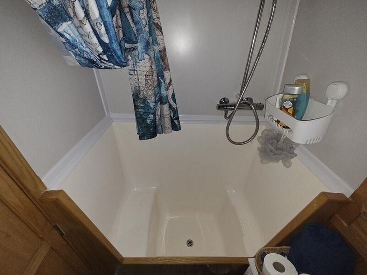 Bathroom: Pump-out toilet, hip bath with overhead shower, vanity unit with sink and storage below.